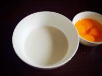 3.淀粉倒去上层的水,加入四个土鸡蛋,用打蛋器充分搅拌均匀至无结块(手动打蛋器比筷子好用,可以避免淀粉结块)。