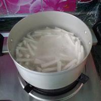7.炖至萝卜条变色变软后,放入豌豆、鹌鹑蛋和金针菇加盖大火